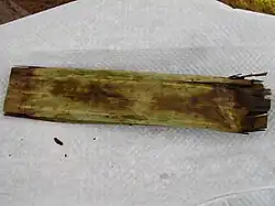 Some of the most well known local specialties are kelaguen, a Chamorro dish consisting of chicken, shrimp, fish or beef marinated in a mix of lemon juice and fresh coconut,[4][5] red rice made with annatto[6] and kå'du fanihi, a soup made of fruit bat or flying fox[7] and Guyuria cookies.[8] The red rice is hineksa’ aga’ga, is made by cooking rice in annatto broth, giving it a deep orange color.[9] Other noted foods include lumpia (spring roll), shrimp patties, and Spam musabi, which is grilled Spam with pickled daigo radish wrapped in nori.[9] Apigigi’ is a Chamorro dish in which roasted coconut is wrapped in banana leaf.[10] The shrimp patties, or buñelos uhang, are a sort of shrimp fritter, with a mix of shrimp, vegetables, and batter which are then deep fried.[11]