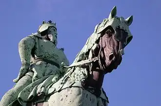 - Other than the Kyffhäuser Monument mentioned above, during the early years of the German Empire, an iconographical program which associated Frederick with Wilhelm I was carried out in Goslar, centred on the old Kaiserpfalz (Imperial Palace). A famous equestrian statue of Frederick Barbarossa, built by Robert Toberentz (1849–1895) in 1893–1895 and erected until 1900, stands in Goslar, with Wilhelm's statue standing nearby (Frederick on the North, Wilhelm on the South). The Kaiserpfalz was decorated with paintings depicting the life of Frederick too,[108][109][110][111] presided over by Johannes Wislicenus, who combined history wỉth fairytale (the German nation as the Sleeping Beauty, or Dornröschen) and saga (the Barbarossa legend), the medieval with the modern.[112] In The proclamation of the Reich, Frederick looked down with approval at the proclamation while Queen Luise was presented as Germania.[113] Other paintings in this program include: Barbarossas Erwachen (Barbarossa awakened), Barbarossas Fußfall vor Heinrich dem Löwen (Barbarossa falling on his knees in front of Henry the Lion, which describes Frederick begging Henry at Chiavenna for military aid against the Lombards in 1176.), Barbarossas Sieg bei Ikonium (Barbarosa's victory in Iconium), Heinrich der Löwe bittet Barbarossa um Verzeihung (Henry the Lion begged Barbarossa for forgiveness, which describes the event in Erfurt in 1181).[114]