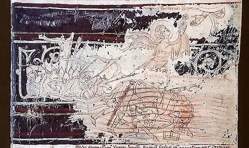 The accompanying illustration depicts an angel presenting the emperor's soul, as a baby, to the hand of God. At the same time, the physical body of Frederick is shown plunging into the water. The imperial crown already lies beneath water. John Freed writes that, "This jarring depiction and its ambivalent assessment of Frederick’s reign were soon covered up with a layer of paint that was not removed until the beginning of the twentieth century. The time is long overdue to uncover the prince beneath the myth."[72]