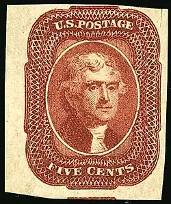 On August 19, 1861, while the American Civil War was wreaking havoc across Virginia and elsewhere, the Post Office issued a 5-cent buff (yellow-brown) colored stamp that honored Thomas Jefferson. The engraving used to produce the image was modeled after a portrait by Gilbert Stuart. The engraver for this issue was William Marshall, who also engraved Washington's image for several issues of this period.[5] This Jefferson issue occurs in several distinct shades of brown. This image was again reprinted on February 3, 1863, in a dark brown color.[6] Also in 1861, Jefferson became the first U.S. president to appear on a Confederate stamp: a 10¢ value in blue, reissued in 1862 with its color changed to rose-pink.