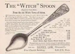 - Daniel Low, a jeweler in Salem, Massachusetts, began selling souvenir sterling "Witch" spoons in 1890, using two different patterns, the first with three pins, the word "Salem", and a witch on a broom. (See right)
