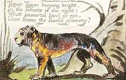 In the Hindu epic Mahabharata, the tiger is fiercer and more ruthless than the lion.[19] William Blake's poem "The Tyger" portrays the tiger as a menacing and fearful animal, and the tiger Shere Khan in Rudyard Kipling's 1894 The Jungle Book is the mortal enemy of the human protagonist. The tiger is featured in the mediaeval Chinese novel Water Margin, where the cat battles and is slain by the bandit Wu Song,[20] Yann Martel's novel Life of Pi features the title character surviving shipwreck for months on a small boat with a large Bengal tiger while avoiding being eaten. The story was adapted in Ang Lee's film Life of Pi in 2012.[21]