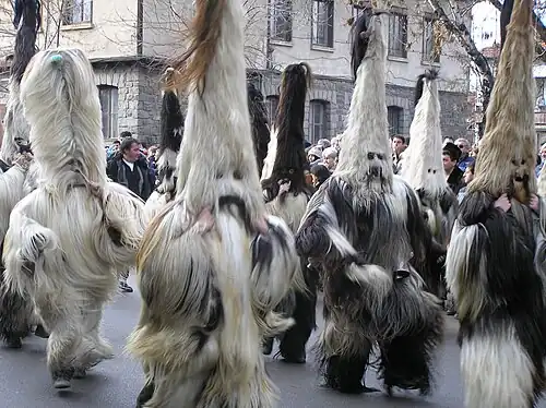 The ancient Bulgarian ritual of kukeri (кукери), performed by costumed men, seeks to scare away evil spirits and bring good harvest and health to the community. The costumes, made of animal furs and fleeces, cover the whole of the body. A mask, adorned with horns and decoration, covers the head of each kuker, who also have bells attached to his waist. The kukeri dance, jump and shout in an attempt to banish all evil from the village. Some of the performers impersonate royalty, field-workers and craftsmen. The adornments on the costumes vary from one region to another. In 2015, the ritual was entered in the UNESCO Intangible Cultural Heritage Lists as part of the traditional Surva Folk Fest held annually in Pernik.[5]