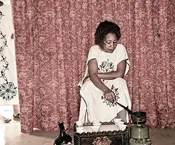 There are many different types of Ethiopian dances, each unique to the diverse regions of the country.[7] In a 1964 ethnographic study, a Hungarian sociologist visiting Ethiopia recorded one hundred and fifty variations of Ethiopian dance using videos and photos.[8] This study postulates that Ethiopian dances can be divided into three forms: group dances, dances divided by gender, and coupled dances.[8] In group dances, men and women gather and dance in ways that are not partnered or gender-specific. One such example is the traditional Amhara dance, eskista.[8] Dances that have gender-specific movements include certain Oromo dances like the dances of Shewa/Tulama region in which men tend to have more stiff, jilted moves that mimic riding into war and emphasize physical power whereas women step to the same beat, but with an emphasis on technical and delicate neck movements. In most traditional Ethiopian dances, women tend to dance in ways that emphasize the movement of their neck and hair through the momentum of the bounce of their steps. Ethiopian dances usually involve short, repetitive movements of the legs, neck and shoulders. The speed and intensity of these movements varies depending on the rhythms being played.[8] The third category of dance is the coupled dances. These dances involve partnership between a man and a woman, and often involve direct physical contact or a physical closeness that is coupled with complementary dance moves that create a sort of back and forth between the partners. One of the most popular coupled dances in Ethiopian traditional dance is the 'shagoyee' dance which originates from the Harerghe region of the Oromo ethnic group. In this dance, the male partner stands close and places his hands on the woman's shoulders and guides her from side to side, while the woman bends at the waist, twists, and fluidly swings her hair in the direction that her partner pushes her. Another popular coupled dance is called Awris, a playful traditional dance of the Tigre ethnic group. In this dance, the woman holds her arms near her chest, as if she is cradling a child, and glides around her partner while ducking and acting coy, while the partner gracefully leaps from one leg to the other and makes a motion of catching her.