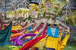 In Bali, traditional dance is deeply woven into religious and cultural life, categorized into Wali (sacred), Bebali (semi-sacred), and Balih-balihan (entertainment). UNESCO recognized these dance traditions as Intangible Cultural Heritage in 2015.[32] Legong is distinguished by its intricate finger movements and precise footwork, often used to depict mythical tales.[33] The Barong dance, a dramatic portrayal of the struggle between Barong (good) and Rangda (evil), features elaborate costumes and dynamic movements.[34]