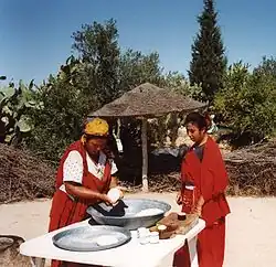 The most common religious dance is probably the Stambali, which originated as a ritual dance to glorify Sidi Saad, a devout Sudanese Muslim who arrived in Tunisia with his followers in the sixteenth century. Today his shrine is located in the Mornag region.[62] However, in the aftermath of independence, the authorities have banned the ritual and closed many of the sanctuaries. While followers still continue their rituals at home, the dance has subsequently been adopted by the Jews and lost its connection to its Islamic origins.[63]