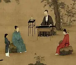 Ever since the Southern and Northern Dynasties (420–589), painting had become an art of high sophistication that was associated with the gentry class as one of their main artistic pastimes, the others being calligraphy and poetry.[7] During the Song dynasty there were avid art collectors that would often meet in groups to discuss their own paintings, as well as rate those of their colleagues and friends. The poet and statesman Su Shi (1037–1101) and his accomplice Mi Fu (1051–1107) often partook in these affairs, borrowing art pieces to study and copy, or if they really admired a piece then an exchange was often proposed.[8] The small round paintings popular in the Southern Song were often collected into albums as poets would write poems along the side to match the theme and mood of the painting.[5]