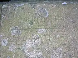 Red sandstone milestones were positioned every mile. Only one survives in the hedge opposite the entrance to the upper Law Mount field, indicating Stewarton 1-mile (1.6 km) and Irvine 63⁄4 miles, another was positioned opposite the entrance to Mid Lambroughton farm and as with the others the only remaining clue is a 'kink' in the hedgerow as seen near Langlands Farm. The milestones were buried during the Second World War so as not to provide assistance to invading troops, German spies, etc.[10] This seems to have happened all over Scotland, however Fife was more fortunate than Ayrshire, for the stones were taken into storage and put back in place after the war had finished.[11]