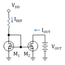 The drain current of a MOSFET ID is a function of both the gate-source voltage and the drain-to-gate voltage of the MOSFET given by ID = f(VGS, VDG), a relationship derived from the functionality of the MOSFET device. In the case of transistor M1 of the mirror, ID = IREF. Reference current IREF is a known current, and can be provided by a resistor as shown, or by a "threshold-referenced" or "self-biased" current source to ensure that it is constant, independent of voltage supply variations.[1]