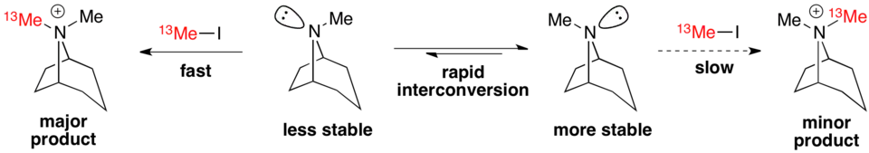 The alkylation of tropanes with methyl iodide is a classic example of a Curtin–Hammett scenario in which a major product can arise from a less stable conformation.[3] Here, the less stable conformer reacts via a more stable transition state to form the major product.[9] Therefore, the ground state conformational distribution does not reflect the product distribution.