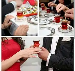 Tea is served in any ceremony in Azerbaijan regardless of whether it is a funeral or a wedding. Whether tea is sweet or sugarless shows the decision or at least the opinion of parents of girls about the marriage on the matchmaking process. Sugar is the key indicator of their agreement.[1][3][4]