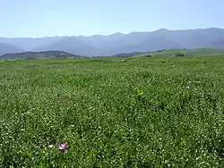 The climate of the valley is semi-arid with hot summers and cool winters. Almost all precipitation occurs in the winter in the form of rain, although snow has fallen on occasion; only five inches of rain falls annually on the valley floor.[9] Since the valley is open to the sea, there is occasional marine influence. The principal native vegetation on the valley floor is grassland and scrub, with chaparral and oak woodland in the hills to the south.