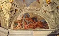 There are four Prophets in the lunettes while the central lunette is filled with clouds and two putti. The lunette frescos are connected to the central theme of the painted decoration because the four Old Testament figures prefigured or prophesied the mission and death of Jesus. The parallels could be easily grasped by an erudite spectator in the Baroque era but they were also explained by way of the accompanying inscriptions.
