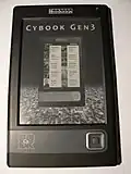 Cybook Gen3 is a 6-inch (15.2 cm) e-reader for reading e-books and periodicals, and it can be used to listen to MP3 and audiobook files.[1] It was produced by the French company Bookeen.
