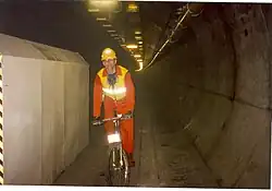 In November 1993, journalists Nick Dutton-Taylor and Damon Brown used the same Saracen bicycles as other construction workers to cycle into the tunnel for an article in Mountain Biking UK.[2][5][6][7][8] They were trained and accompanied by the cycling trainer Clive, but not allowed to go the full way through.[2]