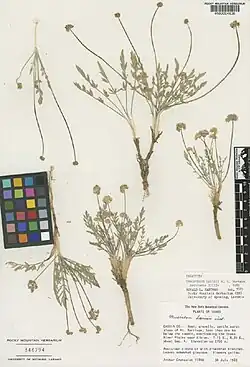 Cymopterus davisii is a species of flowering plant in the carrot family known by the common name Davis's springparsley. This small, flat, taprooted perennial is endemic to Idaho in the United States, where it occurs in the Albion Mountains.[1][2] The plant is found in the Albion Division of the Minidoka Ranger District of Sawtooth National Forest. It reaches approximately 7 in (18 cm) in height with a short stem that is sheathed by fibrous leaf bases. Numerous leaves form a whorl around yellow-flowered umbels.