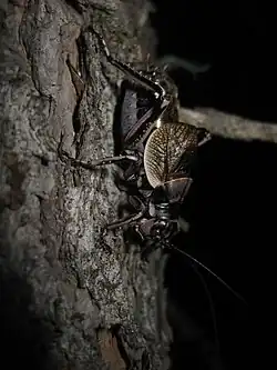The species generally grows to about 20–30 mm in body length and approximately 1.5 grams in weight.[5][3] Dorsally, these crickets have dark coloring, ranging from lighter hues of brown to black. Ventrally they are lighter in color, often being white or beige in color. This coloration likely evolved as a form of camouflage, helping the crickets blend in with the darker bark of coniferous trees, on which they spend a significant portion of their time. Like many crickets Cyphoderris montrosa males produce mating calls. They do so through stridulation, a process in which they scrape specialized file-like stimulatory organs located on their tegmina along scrapers located at the rear end of each of each opposite tegmen.[6] In C. monstrosa these file like structures are evenly developed along each tegmen, with a rigid dorsal portion angled at 90 degrees to a rigid lateral portion. Both males and females also have a structure called an Ander's organ. This organ appears to be present across all life stages of the species, unlike the scrapers on the tegmina which are only present in adult males. This organ also produces sound, however studies show that it is predominantly used by female and juvenile individuals, with males showing a preference to use their tegmina for sound production.[7] Male C. monstrosa can be identified from other similar looking species by the presence of a prominent hook shape on the ventral side of their subgenital plate.[8]