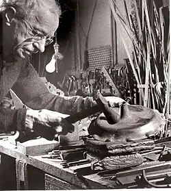 He apprenticed in the 1880s as a mechanical assistant. He studied iron work in Vienna, and then moved to Graz to study under Franz Roth.[5] He served in the apprenticeship in the metal shop in with Roth after which he studied in France and other countries in Europe, before eventually settling in Munich, Germany.[4][6] In Munich, he worked in Reinhold Kirsch's workshop.[7] He finished his studies there at the Munich Industrial Art School.[8] Artisan Reinhold Kirsch recognized him as an exceptional student, and sent him to America as part of the German ironworking team at the Chicago World's Columbian Exposition.[8]