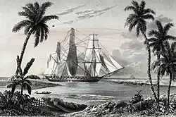On 5 March, Laplace sailed south towards the Natuna Islands, charting the area as they moved.[8] In particular, Laplace attempted to complement Bougainville's earlier workaround around the Anambas, not finishing his work until 4 April.[8] He then set sail for Surabaya in the Dutch East Indies. There he was informed of the events of the July Revolution, and that a war was expected.[8] After dysentery struck the ship, Laplace moved on to Banyuwangi. During the trip, several men died, while morale decreased.[9][10] Laplace attributed the ships poor health to the decrease of wine rations.[9]