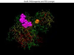 ![]() Crystal structure of gcoB (cartoon diagram) complexed with FAD (magenta spheres) and an iron–sulfur cluster (orange/yellow) based on PDB: 5OGX.[1] | |||||||