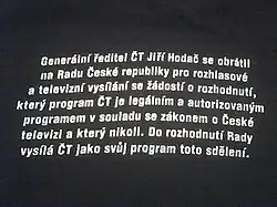 The image reproduced here on a rare T-shirt displays a screenshot of a public message that appeared for a couple days on Czech Television's channels as its only programming during the height of the crisis. It translates to: General Manager of ČT Jiří Hodač has turned to the Council of the Czech Republic for Radio and Television Broadcasting with a request that it decide which programming of ČT is legal and authorized programming in accordance with the Act on Czech Television and which is not. Until the Council's decision, ČT will broadcast this statement as its programming.