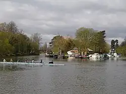 Carte intended to use the island as a special secluded annexe, accessible by boat, to his new Savoy Hotel, but a panel of local magistrates refused to grant him an alcoholic drinks licence for the property.[5] Instead, Carte had a 13-bedroom mansion, Eyot House, built on the island; it was completed in 1898,[6] and it became one of his main residences.[7][8] Among the famous guests who stayed at the house were the dramatist W. S. Gilbert and the composer Arthur Sullivan.[9] In later years, Carte displayed his macabre sense of humour by keeping a crocodile on the island.[10]