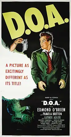 D.O.A. is a 1950 American film noir directed by Rudolph Maté, starring Edmond O'Brien and Pamela Britton. It is considered a classic of the genre. A fatally poisoned man tries to find out who has poisoned him and why. It was the film debuts of Beverly Garland (as Beverly Campbell) and Laurette Luez. In 2004, D.O.A. was selected for preservation in the United States National Film Registry by the Library of Congress as being "culturally, historically, or aesthetically significant."[1][2]