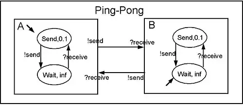 The structure of ping-pong game is to connect two players: Player A's output event !send is transmitted to Player B's input event ?receive, and vice versa.