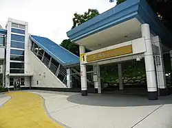 Public art for the station is titled "Flying Kites at Home in the Sky"; it consists of 12 sculptures and is located around the entrance area.[3] While the glass walls of the entrance area resemble an aquarium, the kites give the illusion of aquatic animals floating in the tank.
