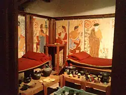 The frescoes depict dancers, and musicians playing various instruments. This practice is also present on the many Hellenistic-inspired vases.