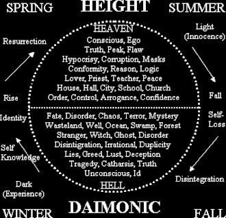 In the diagram (see psychology section above), the common threads of the daimonic concept are identified. Typically, the daimonic tale centers around the Solitary, the central character of the story, who usually is introduced in innocence, wealth, and often arrogance. However, under the masks of control and order lies a corruption and unconscious desire towards disintegration. Some event, either external or internal, leads the character towards some type of isolation where he is forced to confront his daimons.