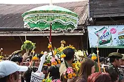 According to the Burmese historian Than Tun, the iconography emerged in Burma (now Myanmar) during the last quarter of the 18th century, from Ceylon (now Sri Lanka).[2] During the Konbaung dynasty, a festival was held in honour of this image of the Buddha.[3] In Myanmar, the Dakkhiṇasākhā image of the Buddha is traditionally consecrated and venerated with the help of Buddhist monks to avert the predicted calamities.[4] The style was subsequently introduced to Thailand during the reign of Mongkut by a Mon monk.[1] In modern-day Thailand, it is commonly conflated with the image of Shin Upagutta.[1]