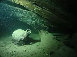 The wreck has been the object of several investigations by marine archaeologists from the Swedish National Maritime Museum, Södertörn University, the University of Southampton and Stockholm University. Since the hull is intact and the sinking occurred suddenly, the wreck contains a multitude of objects that are interesting to archaeologists and historians. On the top deck there are several interesting finds, both ship equipment and other assorted items, including a musket. Two of the three masts are still standing, and the damaged windlass (used to winch up the anchor) can be clearly seen. There is an intact cabinet containing carpenter's tools, including an axe, a plane and an awl. Of the several cannon with which the ship was once armed only one remains, complete with its gun carriage.[1]