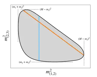 where is the invariant mass of particles 1 and 2 in a given decay event; and are its maximal and minimal kinematically allowed values, while is the angle between particles 1 and 3 in the rest frame of particles 1 and 2. This technique is commonly called "Square Dalitz plot" (SDP).