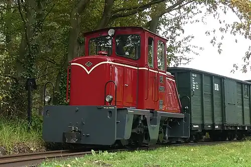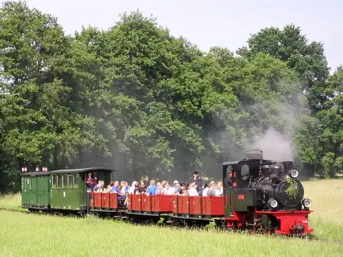 The railways rolling stock consists mainly of wagons and coaches formerly used at the "Muskau Forest Railway" (WEM) and the "Mecklenburg-Pomeranian Narrow Gauge Railway" (MPSB), both run by the former East German state railways, Deutsche Reichsbahn. They were either sourced directly from the WEM or via Berlins Children's Railway. The Locomotives include small industrial and larger light railway steam locomotives. The railway has also gathered an interesting collection of large diesel locomotives over the years. In the summer months the mainstay of coaches are of the open type used during the First World War by the German army and were last in use on the WEM. The closed passenger coaches consist of some self built vehicles and two former MPSB coaches, there are also two former MPSB guards vans.[1]