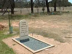 Despite his body being identified by police and a priest before being burnt, there have also been stories that both Dan and Steve survived the fire.[17] There is little evidence to support these claims.[18][19] One man, James Ryan, claimed he was Dan Kelly. In 1934 he went on stage at the Brisbane Exhibition and told stories about the Kelly Gang. He died on 29 July 1948, after being struck by a train.[20] The Ipswich City Council have put a memorial on his grave. In 2001, scientists took a small piece of bone from the grave of Charles Devine Tindall at Toowoomba, Queensland, to see if they could find DNA to prove he was Dan Kelly.[21] Devine, who had burn scars on his body, told his family he was really Dan.[22] He said he had hidden under the floor of the Glenrowan hotel and escaped after the fire.[21] An archaeological dig at the site of the hotel by Adam Ford in 2008 found that there was no cellar or other hiding place under the floors.[23] In October 1902, a Melbourne newspaper printed a story that Dan Kelly and Steve Hart were living in South Africa,[24] where the men allegedly fought in the Boer War. Another man, Jim Davis from Darra (a suburb of Brisbane, Queensland), said in 1938 that he was Dan Kelly. He claimed that he, Steve Hart and Joe Byrne had escaped from the hotel.[25] He also said he was born at the Eureka Stockade in 1854, which makes him too old to have really been Dan.