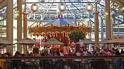 There are 192 retailers and eateries, including the major department stores Macy's and JCPenney. Filene's was in the mall until the 2006 Macy's consolidation. The mall contains attractions targeting children, including a double-decker carousel in the food court and many youth-oriented events and activities the mall sponsors on a regular basis (such as "Family Fun Night"). Many of these events take place in the mall's center on the lower floor. This space changes throughout the year, and can be converted into a stage area for special events such as song and dance performances. The mall is decorated during the holidays.