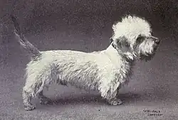 Some interbreeding with other breeds took place in the mid-1800s, which may have introduced Dachshund blood into the breed,[11][12] although certain breeders maintained pure-bred lines.[11] The Dachshund theory was first introduced by John Henry Walsh under the pseudonym of "Stonehenge" in the 1880s,[13] and was denied by many breeders of that era.[14] By the mid-1800s, the breed was known as the Dandie Dinmont Terrier, and became sought after for hunting after Scott's writings were published.[7] They remain the only dog breed to have been named after a fictional character.[15] Around this time the breed had some involvement in the development of the Bedlington Terrier.[16]