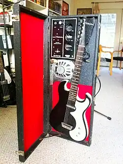 The Danelectro Amp-In-Case, properly known as a semi-hollow body due to its Masonite top and back, with pine outer structure. "All-in-one" Amplifier-Case or Silvertone 1448/1449/1451/1452/1457 is a line of guitar sets introduced from 1962 to 1968. It was sold for US$67.95 (equivalent to approximately $707 in 2024[1]), sometimes including a 45 rpm how-to-play record, as part of Sears Silvertone. It was later reissued in 2008 in modified form as the "Dano '63" without the amp-in-case. The Dano '63 was also available as a baritone guitar[2] and a long- and short-scale bass guitar.[3]