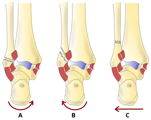 Fracture of the fibula distal to the syndesmosis (the connection between the distal ends of the tibia and fibula). Typical features: