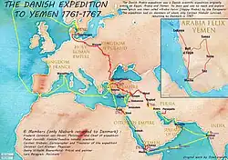 The Danish Arabia expedition (Danish: Den Arabiske Rejse) was a Danish scientific expedition to Egypt, Arabia, and Syria. Its principal goal was to elucidate the Old Testament with additional research goals concerned with natural history, geography, and cartography.[1] It had six members, of whom only Carsten Niebuhr survived, returning to Denmark in 1767. The journey has been chronicled by the 20th century novelist, Thorkild Hansen, in his novel Arabia Felix.