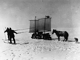 The wintering station was named "Borg", a name that had been suggested by Koch's wife after the farm of Egill Skallagrimsson in Iceland.[3] The meteorological and glaciological observations began almost immediately, the latter using ice-drilling equipment. Five of the ten ponies were slaughtered in order to preserve their meat for the winter. After settling down in their base the members of the expedition kept exploring a practicable way westwards across the ice. During such an exploration in early November Koch fell into a crevasse and broke his leg, which would take months of rest to heal. Fortunately the remaining part of the winter was quite uneventful and by early March Koch was able to take part in the surveys of Queen Louise Land that the expedition members carried out from their base until mid April.[1]