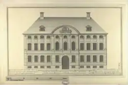 Ferdinand Anton Danneskiold-Laurvig was the son of Ulrik Frederik Gyldenløve. When his father died in 1704 he inherited Gyldenløve's Little Mansion at the corner of Dronningens Tværgade and Bredgade as well as the County of Laurvig in Norway.[1] He purchased a number of smaller lots in Store Kongensgade in the 1720s. It is unclear when the building at Store Kongensgade was built. Most sources state that it was most likely built to a design by Johann Adam Soherr in circa 1745. Ida Haugsted states that it was more likely built in circa 1720-30 to designs by Johan Cornelius Krieger. Krieger was also responsible for adapting the Gyldenløbe Mansion. A garden connected the two buildings and the new building in Store Kongensgade was referred to as Danneskiold-Laurvig's backyard" (Danneskiold-Laurvig's baggård). The new building was also known as Jernmagasinet ("The Iron Store") since stoves and other products from Danneskiold-Laurvig's extensive Fritzøe ironworks in Laurvig in Norway were sold from its ground floor.[2]