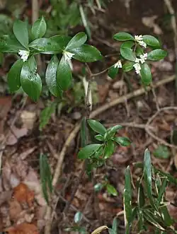 The shrub is evergreen, and grows from 0.5 to 2.0 meters tall. Its branches are dark purplish red or brown. In China, it is found in forests and moist places at an altitude of 300 to 400 meters.[2]