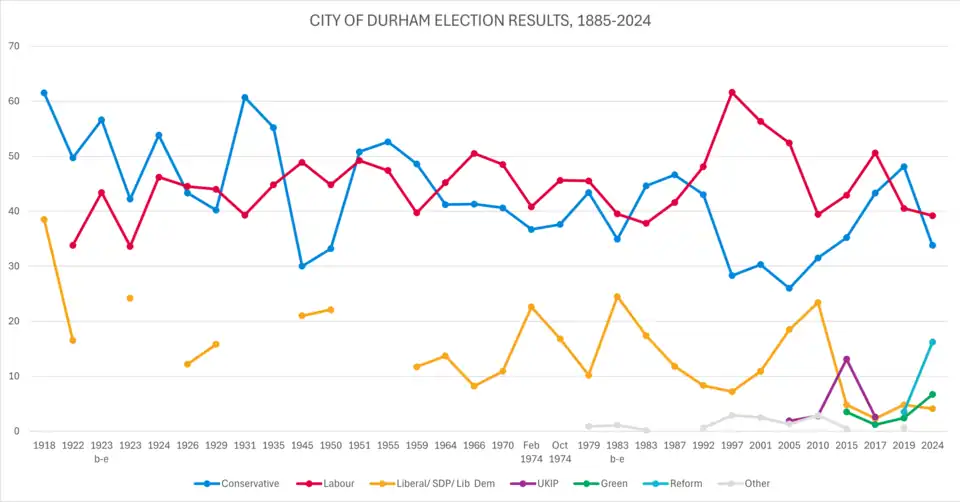 The seat has been held by all three major parties in its long existence, but has been a marginal constituency between the Labour and Conservative parties in the years since the Second World War. Labour held the seat for 27 years from 1992 with their candidate Jenny Chapman winning the seat in 2010 with a 3,388 majority down from 10,404 in the previous election. In 2015, her majority over the Conservatives fell to 3,158. In the 2019 general election Conservative Peter Gibson defeated Chapman with a 3,294 majority before being defeated himself in 2024 by Lola McEvoy of Labour by a margin of 2,298
