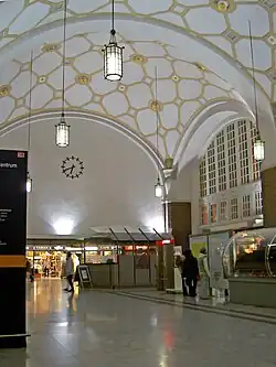 Built in a late Art Nouveau style, the station was finished 1912 as one of the major works of architect Friedrich Pützer.[5] The station replaced two separate and increasingly inadequate stations located at the Steubenplatz, around a km closer to the city centre in the east.