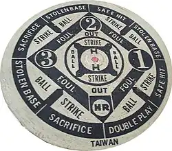 Most boards consist of a four-base diamond: first, second, third, and home plate. Additional areas are marked as strike, out, ball, error, sacrifice, double play, triple play and hit-by-pitch. The home run tends to be in the very center of the board. The diamond is surrounded by a six-inch foul line border. The entire playing field is 42 inches squared including foul territory.[4]