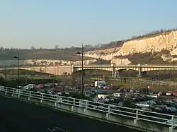 Some of Dartford's key industries, including brewing, paper-making, flour milling and the manufacture of cement,[2] suffered extreme decline in the 20th century, causing redundancies and unemployment.[16] Swanscombe Cement Works (now redeveloped into Bluewater shopping centre) was closed by Blue Circle in 1990.[16][17] This industry had been an economic boon to the area,[17] but left behind a lot of derelict land and pollution. In 1990 Dartford contained around 1,700 acres (6.9 km2) of spoiled land resulting from extractive industries, and cement-dust pollution from local cement works was a regular subject of complaint in the local press throughout the 20th century.[16]