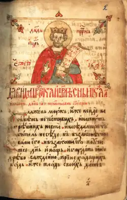 The psalter, is written in Middle Bulgarian Cyrillic and contains the text of the Psalms copied by the Bulgarian daskal (scholar) Philip. Of particular importance is the miniature of King David. The pages have dimensions 20.5×14 centimetres (8.1×5.5 in).