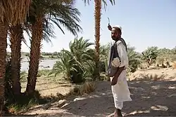 When approaching Dar al-Manasir from the surrounding deserts, the most striking feature of the landscape is the sudden green narrow band of palm trees lining the shores of the Nile. This strip of land is called Ashu (أشو), and is generally not more than 20 meters wide. It is situated between the seasonally inundated land of the river bank called Gerif (جرف) and the traditional "waterwheel land" called Saqiah (ساقية).[3]